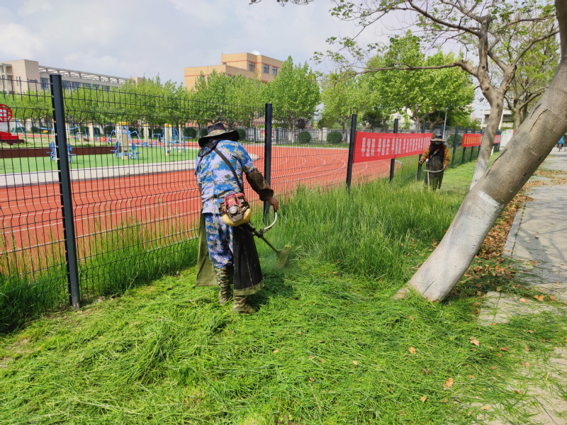 5月11日中午,在淮海农场职工休闲体育运动广场围栏外侧,两个全副武装的环卫员工,正拿着“嗡嗡”马达声的草坪修剪机快速地修整着草坪,被剪下的杂草沿着一个方向喷溅着,随即,被剪下来的杂草被随后的环卫职工清扫运走,栅栏内外草坪修剪不修剪的对比一目了然,一个齐整的草坪就出现在人们的眼前。