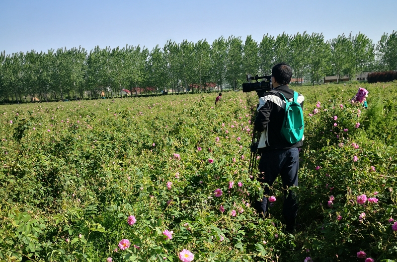 5月12日清晨,一架“小飞机”从玫瑰花海低空掠过,引得采花人群仰望看稀奇,这是东台市新闻传媒中心在拍摄专题宣传片,为新曹农场建场60周年献礼。一群专业记者拿着“长枪短枪”,有的聚焦花朵拍美丽,有的聚焦“采花娘娘”摄视频,6名特邀“采花演员”配合老记们完成各种造型,为专题片丰富镜头。采花、运花、装框出售、加工精油等生产流程真实地记录在镜头中,合成在演片里,为新曹高效农业发展宣传助威。