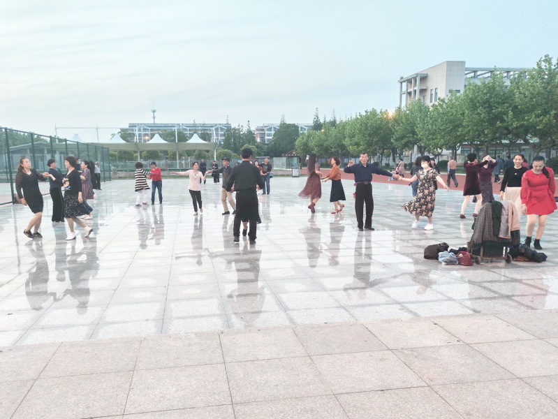 “现在我们职工居民的日子越来越好了,农场社区的业余文化平台让我们更是有时间开展了娱乐,这个职工休闲体育运动广场搞得好,既锻炼了身体也陶冶了情操。”每天在广场舞蹈池中跳交谊舞的居民陈巧梅高兴的对笔者说。图为安装在门球场边上的两只音箱和职工居民在跳舞时的镜头。