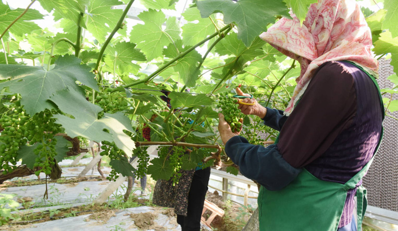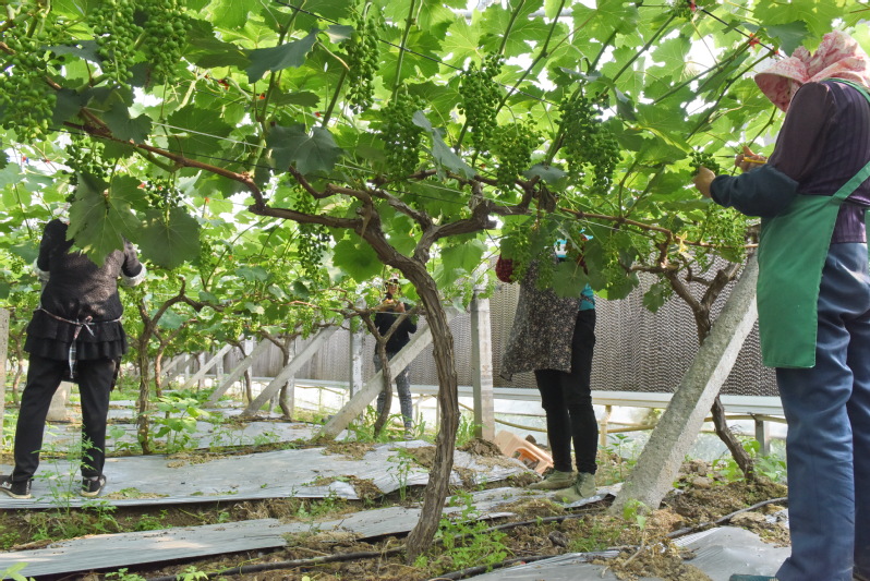 5月26日,在淮海农场高效园区5亩连栋大棚内,农场社区的职工正在大棚内葡萄架下进行疏果,以提升葡萄籽粒的饱满度和穗的整齐度。随着近年来淮海农场高效园区葡萄种植知名度的提升,相应的葡萄品种也成为了人们夏季水果的最爱,而为了进一步提升农场葡萄的品质,淮海高效园区通过往年的经验和教训,以及外地果农的指导,园区对三个葡萄品种从技术栽培层面进行提质。目前,葡萄已陆续进入疏果季节,园区及时组织专业人员对员工进行疏果技术培训,并组织专门人员强化对每一串葡萄的蔬果管理,确保葡萄以籽大粒圆的优良品质博取眼球,走俏市场,从而实现园区的增产增收增效。