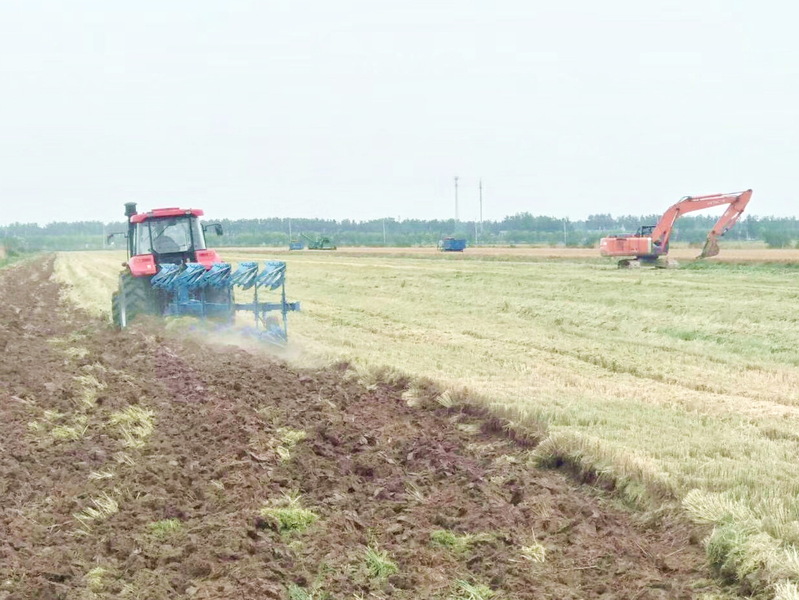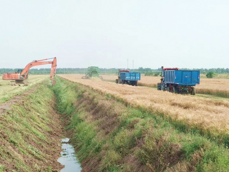 这边田间的大麦刚开镰收割,后边悬挂着的翻转犁耕地机械就紧忙着从田间一侧开始翻地作业,那边大型挖掘机跟随收割机后对田间的农沟进行疏浚护埂,整个儿田间是农机具唱主角,一派繁忙的景象,这是我们在江苏农垦淮海农场有限公司二分场社区的田间地头见到的一幕。