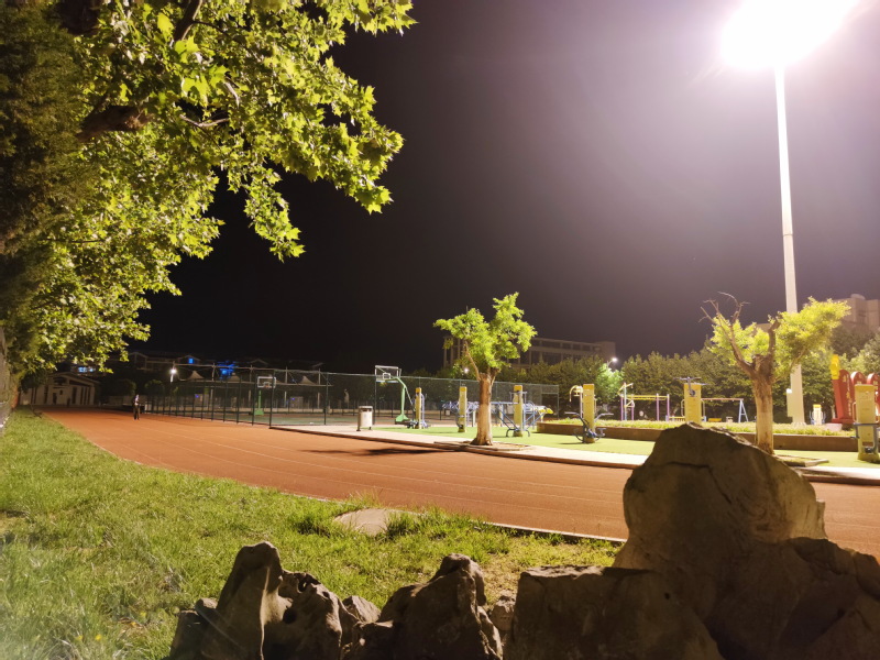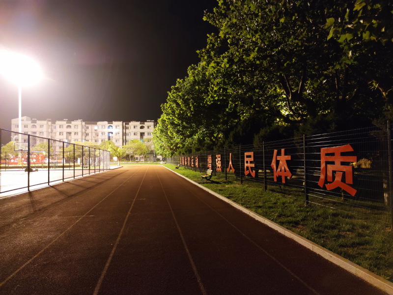 农场人的作息时间与城里人不同,与广场上夜幕刚降临的热闹相比,当时间过上夜间9点时分,同样在职工休闲体育运动广场内却很难看到人了,他们回家坐上床上美美地看着电视,或是早早地沉浸梦乡,把一天的行程收纳。而此时如果你还走在广场上,就可享受着广场内少有的宁静和静谧时刻。静逸的舞蹈池犹如一面水的池塘,倒映着健身器材和景观灯,为美丽的夜色增添新的美景。广场内的各种健身器材此时全部静了下来,在光影下显得格外壮美。栅栏上“发展体育运动 增强人民体质”的红色立体字型,红得更艳,在夜色中别有一番风致。降红色的塑胶跑道齐齐整整,与周边浓密而又青绿摇曳的梧桐树相得益彰,如诗如画和一动一静的完美结合,给人以非常地亮眼。