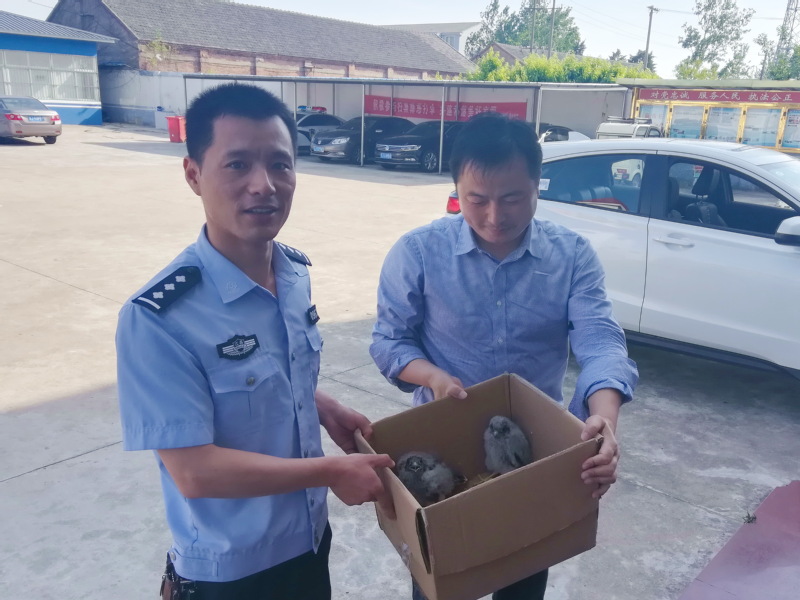 顾卫星走之前对派出所的干警强调,如果今后再遇到职工居民捡拾到到雏鸟或是落难的燕隼、老鹰、金雕之类的猛禽时,要在第一时间通知野生动物保护部门。特别是看到它们拉出黄绿色粪便及精神萎靡不振时,说明它们可能患病了,要赶快将其送到兽医诊所诊治,千万不能拖延。图为农场派出所在将燕隼雏鸟转交给来人和燕隼雏鸟当前的状态。
