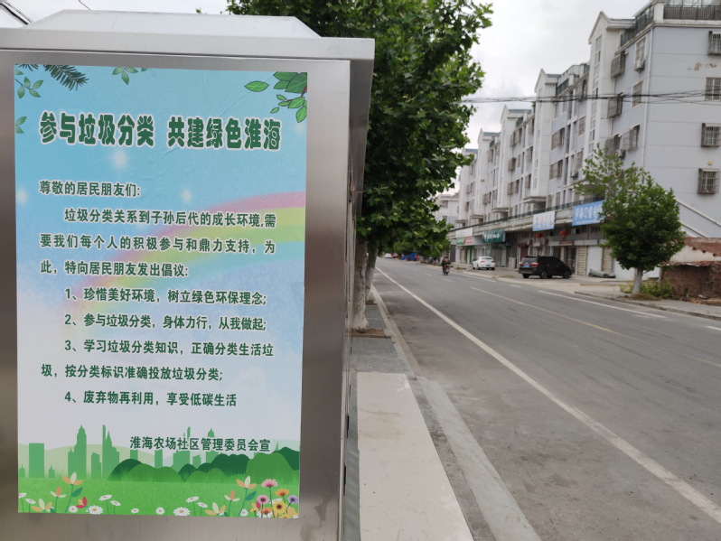 我们注意到,在分类垃圾箱的一侧还有一张垃圾分类宣传海报,上边以淮海农场社区管理委员会给居民朋友们写一封信的形式,来参与垃圾分类 共建绿色淮海。信中倡议职工居民一要珍惜美好环境,树立绿色环保理念;二要参与垃圾分类,身体力行,从我做起;三要学习垃圾分类知识,正确分类生活垃圾,按分类标识准确投放分类垃圾;四是废弃物再利用,享受低碳生活。
