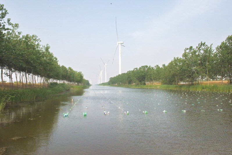 在贯穿淮海农场三分场社区的北八滩河上,碧蓝的天空、转动的风车、摇曳的绿树、碧绿的河水,以及铺满整个河道又整齐划一的养珍珠设施,让整个河道风景突显在你的眼前,让人感到的不仅是两岸层林尽染,水色澄静如练的美景,构成一幅绝美的画面。更让人感叹到产业经济在农场区域发展而带来的魅力,也只不过用了没几年时间,河道养蚌在这时却成了人们眼前不断扩大的产业,让生态河道发挥出较好的经济效益。现在把我看到的美景风光呈现出来,让大家一同感受下养蚌产业给大家带来的视觉风暴,在这里欣赏优美的河岸风景。