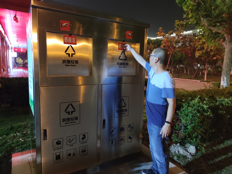 同时,农场为多举措打通垃圾分类“最后一公里”的难题,迅速让新型垃圾房在农场社区各个区域普及起来。农场社区通过加大资金、科技和人力投入,通过吸取新型垃圾房的建造工艺,整合农场社区的资源优势,逐步设计建造符合淮海特色的垃圾分类房,同步配备好太阳能、紫外灯等硬件设施,做好垃圾分类的无害化处理。另外还需要加强对环卫工人的垃圾分类培训与管理,完善相应的监管监督体制,建立健全垃圾分类措施和评价考核体系,使自觉对垃圾分类成为农场社区每一个职工居民的自觉行动。图为农场游客在夜间感受下感应式垃圾房开启投料门时的镜头。