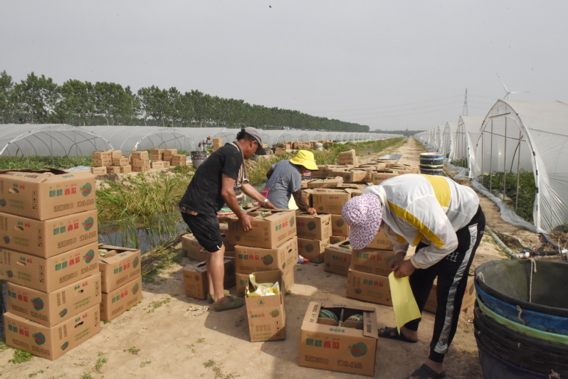 我们在现场看到,农场西瓜种植基地上搭建了4000个左右的西瓜大棚非常地壮观,与当前三夏时节麦稻的收插现场形成了鲜明的对比,这也成为农场借助民营资本在农场发展现代高效农业的一景。棚内挨排排挤在一条线上的西瓜格外显眼,显示着旺盛的西瓜生长场景;棚外瓜农们正在麻利地将采摘出来的西瓜装箱、贴着商标;一辆辆外地物流车辆鱼贯地等候着,一幕又一幕的场景彰显出这里的繁忙。