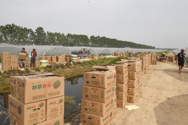 我们了解到,目前在淮海种植的头批西瓜已经俏锁市场,每亩七八千斤的产量让瓜农们喜笑颜开,并且第二批西瓜秧苗也陆续定植管理,前茬接后茬的种植模式,让瓜农们非常地忙碌。据悉,瓜农们将在一年的时间里,将在大棚内收获三四茬西瓜,以在有限的土地上,发挥出效益最大化的产出效应。图为淮海农场西瓜种植基地里的瓜农在包装西瓜时的镜头。