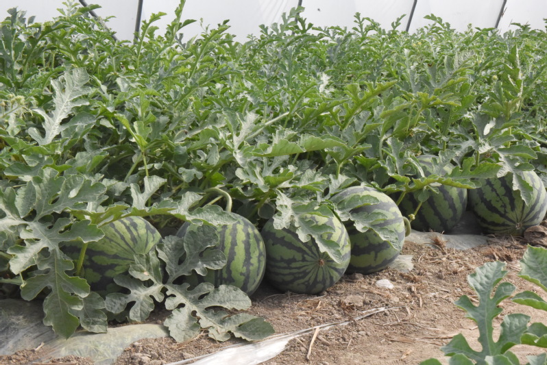 走进还没有采摘的瓜棚内,大棚内西瓜分栽在棚的两侧,中间的一条小道两侧,座满了一个个硕大的西瓜,简直是挨排排地座落在一起,让人看了十分喜爱。