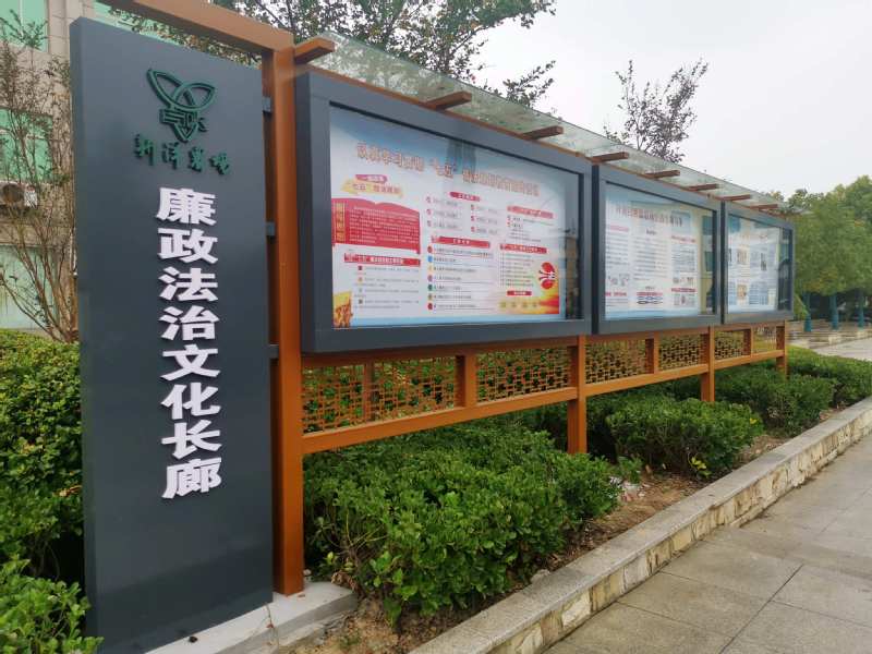 廉政法治文化宣传栏,内容丰富,形式活泼,常常吸引群众纷纷驻足。广场四周设立20多块宣传标牌,既装饰美化了环境,又充实了思想政治内容,人们或漫游信步,或静坐小憩,目及之处,廉政法治文化清新醒目,引人入胜。廉政文化步道两侧是廉政文化小故事,有历史名人的廉政传说,也有当代伟人的廉政典故。间插格言警句、法律法规、廉政建设等方面的内容。造型别致,内容深邃,通俗易懂,老少咸宜。法治宣传LED大屏循环播放法治宣传教育警示片,是群众吸收信息、接受教育的现代化窗口。