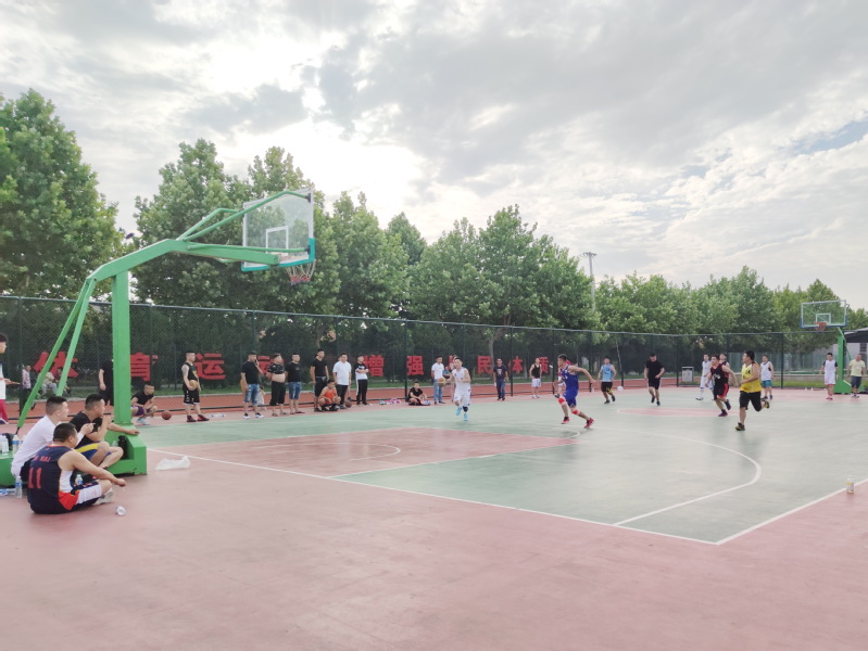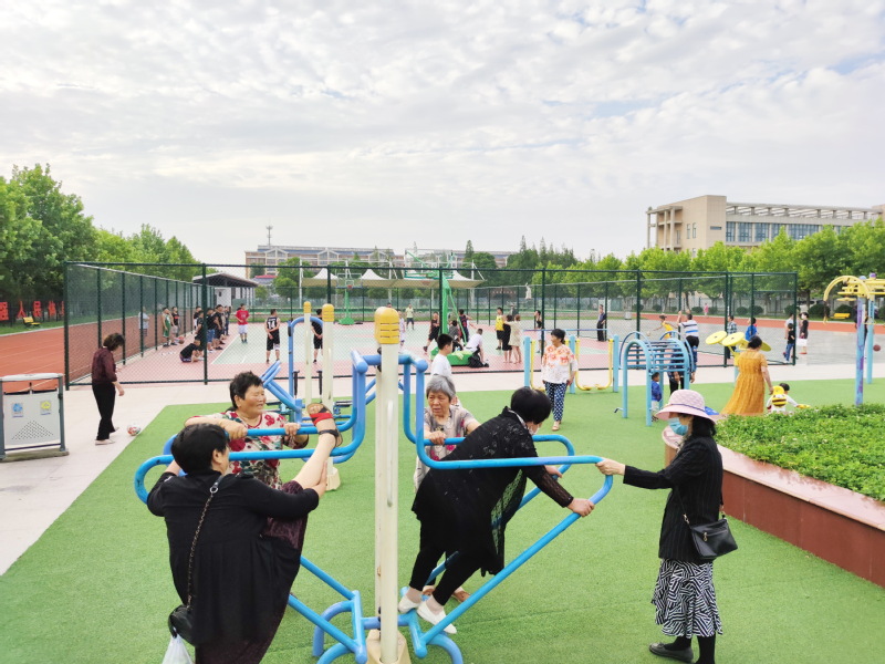每天傍晚时分,当你来到淮海职工休闲体育运动广场时,就发现来这里健身的职工居民真是个多,尤其是在健身器材、塑胶跑道和篮球场上甚是热闹。你瞧那红色的塑胶跑道上一波接着一波的人流沿着逆时针的方向有序地散着步;近30套各式体育健身器材上中老年人在悠闲地玩耍着、闲谈着,他们或转、或踏、或拉、或跨,好不热闹;那个今年才封闭起来的篮球场简直就是青年们的领地,他们正在相互追逐,展示球艺。广场上既有交谊舞曲带来轻柔的音乐,又有篮球场上的呐喊声,期间还夹杂着小孩的欢笑声,使绿树簇拥下的上万平方米的职工休闲体育运动广场成了农场人休闲游玩的大舞台。