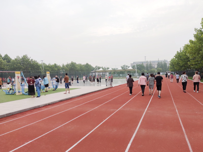 近几年来,淮海农场公司党委一班人以职工居民的需求为抓手,大力发展农场社区的健康体育活动平台建设,他们从解决职工群众关心的热点难点问题入手,积极为职工群众办实事,做好事。其中职工休闲体育运动广场就是农场公司为职工居民打造健康体育活动的重点区域,这里不仅修复了塑胶跑道、还建起了老年人喜爱的两座门球场、为交谊舞蹈池铺设的适合跳舞的地板砖、为职工居民活跃的篮球场配置了封闭式的网状安全防护设施,同时还对损坏的周边围栏进行了更新,兴建了一座高档的内外用公共厕所,所有这些,正如农场公司刚给加装在栅栏上的毛泽东主席曾经提倡的标语那样,他们的出发点就是“发展体育运动 增强人民体质”,让人民群众更好地享受便利的健康体育设施,从而达到“我运动、我健康、我快乐”的目的。