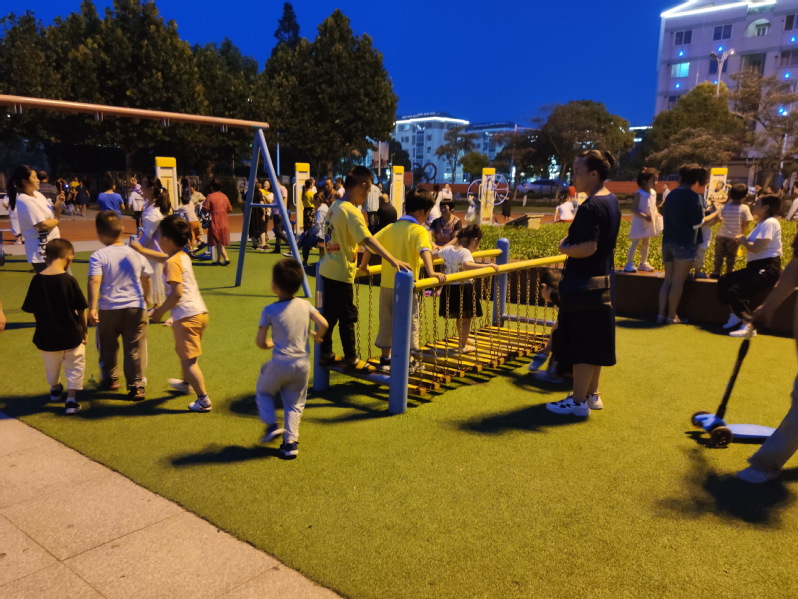 另外如果让孩子们在户外尽情玩耍,可以增强彼此接纳、培养友情的机会,即便是有问题或是孤僻的学生,户外活动多了,他们也就变得喜欢与同学分享,我们只是要注意孩子们的安全。所以说,为了孩子有个健全的身心,我们就多让他们在户外自由地玩耍吧!图为夜幕下淮海农场的孩子们在健身器材上玩耍时的镜头。