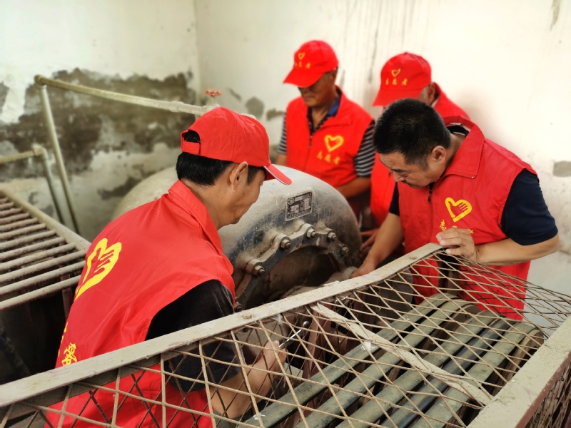 6月29日下午2点,刘圩居委会内闸塘泵站出现故障,塘内水位急升,危及辖区居民安全。得知消息,志愿者突击队的杨家春、刘福香等五人立即赶到现场。经过检查,是水泵叶轮被杂物堵塞。简单清理掉水底杂物,他们就投入到繁琐的叶轮清理中。裹满黄油的螺丝又湿又滑,机组内的机油又黑又稠,暗黑的泵房里闷热潮湿,蚊虫肆虐。下午3点10分,他们终于把叶轮撤了下来,再看时,他们一个个变成了满头满脸油污的“大花脸”。腐烂的植物、破旧的衣服、鞋子等各式杂物把叶轮缠绕得严严实实,发出阵阵恶臭。他们全然不顾,一点点把它们清理干净后,再重新安装上。下午5点,拧紧最后一颗螺丝,合上电闸,“隆”伴随着机器的轰鸣,看到泵站涌动的水流后,他们才蹲到自来水下冲洗手和脸。