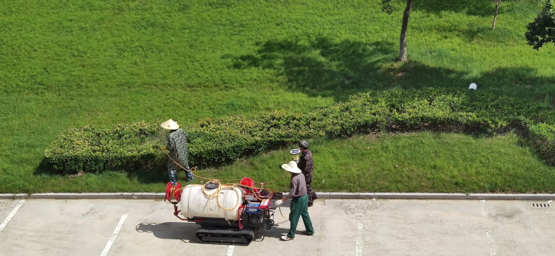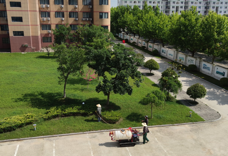 夏季,苗木进入生长旺盛时期,同时,苗木也迎来了许多威胁。夏季高温高湿的环境给许多病菌的繁殖和虫害的滋生提供了极好的条件。高温高湿极易诱发多种苗木病虫害,如在病害上有锈病、白粉病、煤污病、叶斑病等叶部病害,及溃疡病、枯枝病、腐烂病等枝干病害;虫害上有天牛、柳蝙蛾、木蠹蛾、红蜘蛛、介壳虫等。先前由于众所周知的原因,一些单位因为没有重视景观苗木的管护工作或是重视程度不够,孰不知树木病虫害一旦爆发,不仅影响树木观赏效果,严重时会导致树木死亡,造成经济损失,而且病虫害极易扩散到其他绿地,加大侵染面积。为了避免此种情况和现象的发生,农场绿化苗木管理所针对历年来农场绿化景观苗木的生长情况,建立了绿化苗木管护档案,了解本辖区树木品种、易发病虫害种类、发病时间,通过经常巡视,有的放矢进行病虫害的防治工作。每到关键的时间节点,就派出了专门的病虫害防治小组,轮番对场域内的苗木进行预防性的保护工作,有效地建立起了对景观绿化苗木的保护。图为农场社区绿化环卫所的员工正在联手进行苗木预防性的病虫害防治工作。