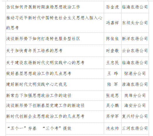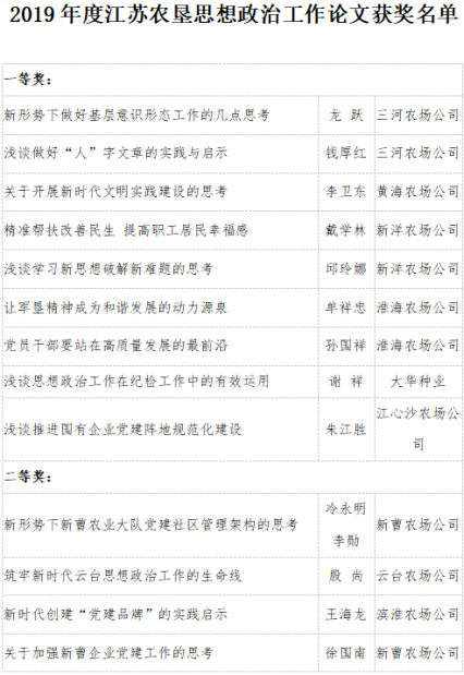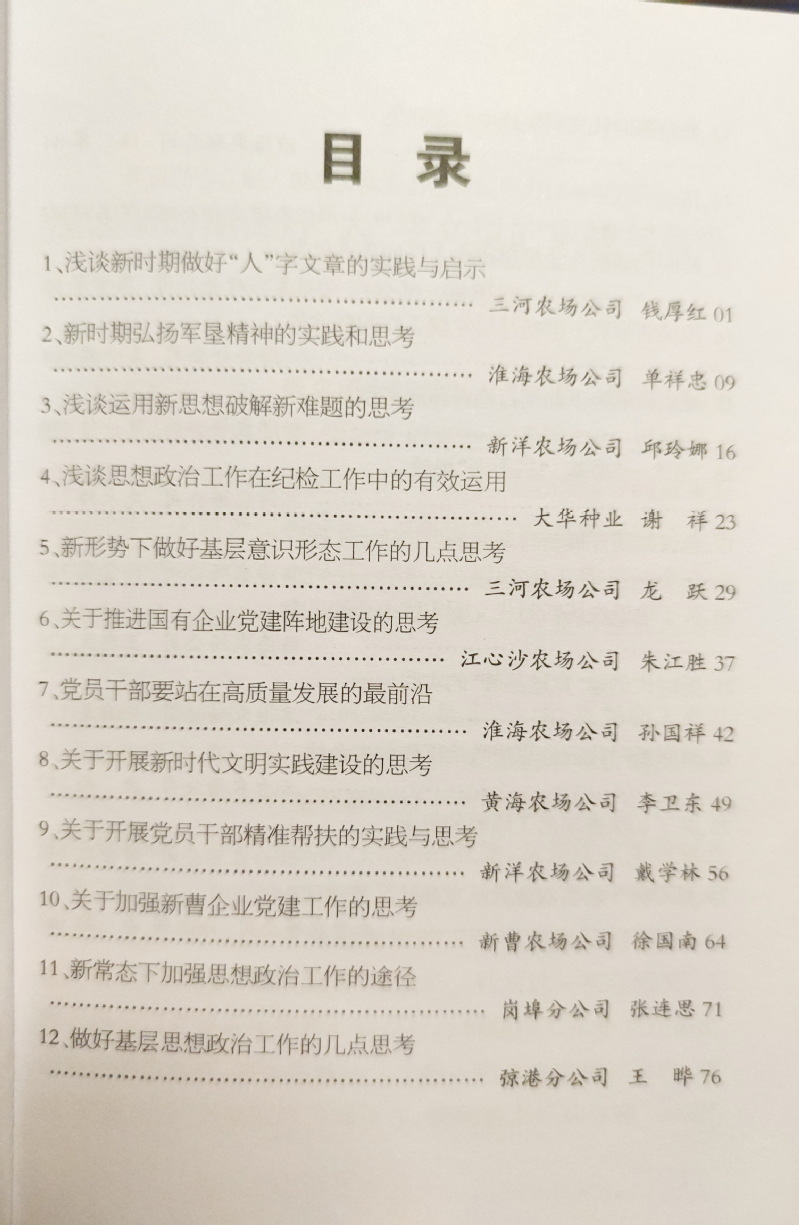 近日在江苏省农垦职工思想政治工作研究会第八次会员大会暨2020年度政研会年会发行的,由江苏省农垦职工思想政治工作研究会、江苏省农垦集团有限公司党委宣传部编印了《耕耘与收获》思想政治工作研究与学习思考成果集上,共选录了获得一二等奖的24篇基层政研分会报送上来的作品,其中淮海农场公司单祥忠的《让军垦精神成为和谐发展的动力源泉》、孙国祥采写的《党员干部要站在高质量发展的最前沿》、陆军的《建好新时代文明实践中心之我见》等三篇论文入选,是入选《耕耘与收获》书籍中文章篇幅最多的农场之一,占入选文章录用数量的12.5%,
