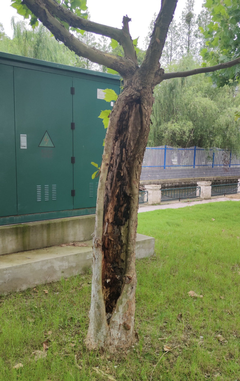 这种空了心的梧桐树虽然能正常生长,但缺少了木质部的支撑,树体还是略显柔弱,一旦遇到强风的侵袭,树干也很容易扭曲,并且这种树也有碍于观瞻。但我们为了树木在这样的环境下还能自如地健康生长,不得不佩服大自然的力量。