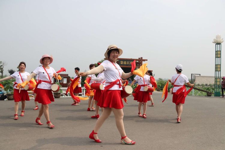 2017年5月8日,22人,平均年龄60岁的“舞哥腰鼓队”统一穿着红服装、挂着红腰鼓,在宝应湖农场职工文化广场进行练习。没有指导老师,他们自己学。会上网的顾晓萍从网上找来视频,先自己学会,再手把手地教队员。