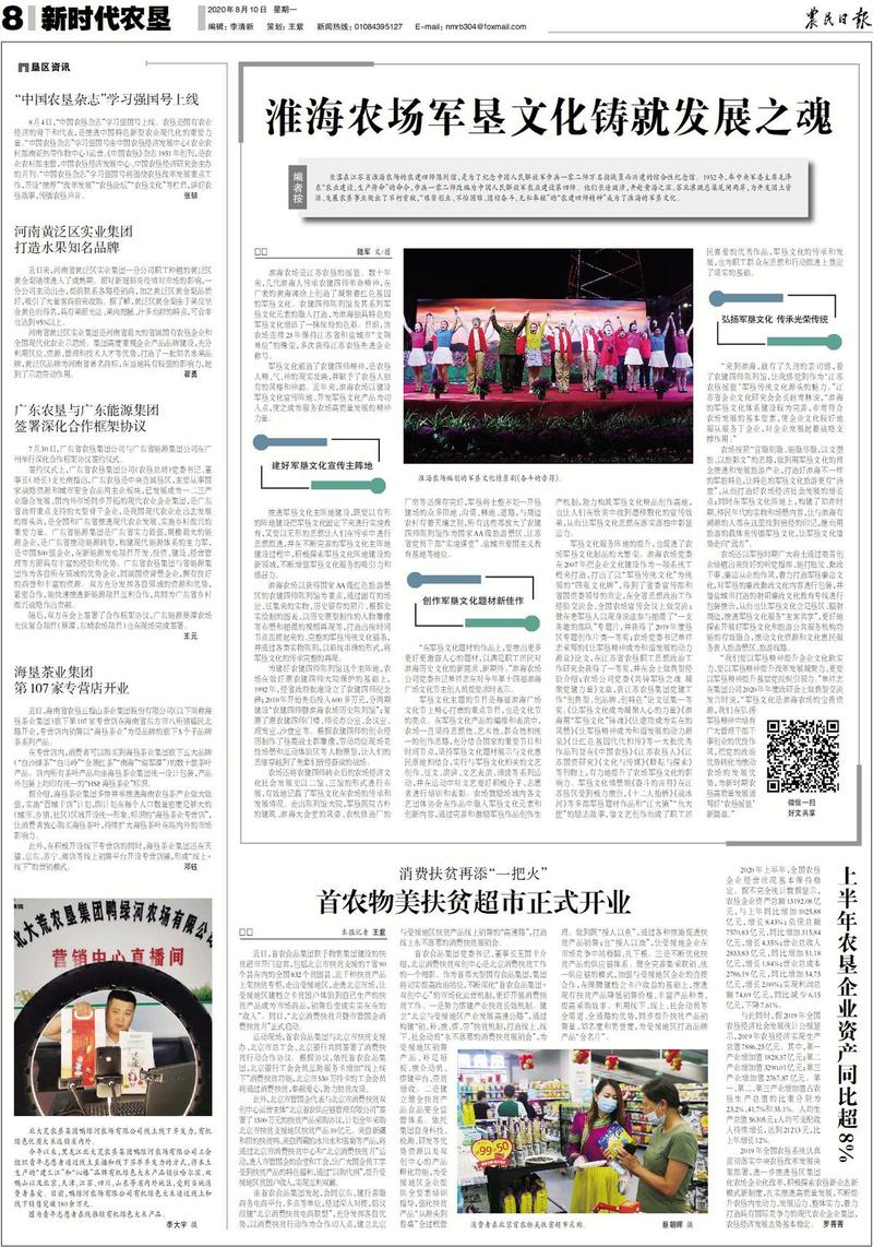 这是一篇加入编者按的《淮海农场军垦文化铸就发展之魂》文章出现在8月10日出版的农民日报《新时代农垦》栏目上,用大版篇幅报道了淮海农场创建的军垦文化内容。