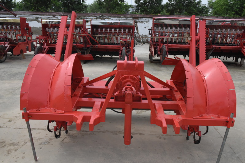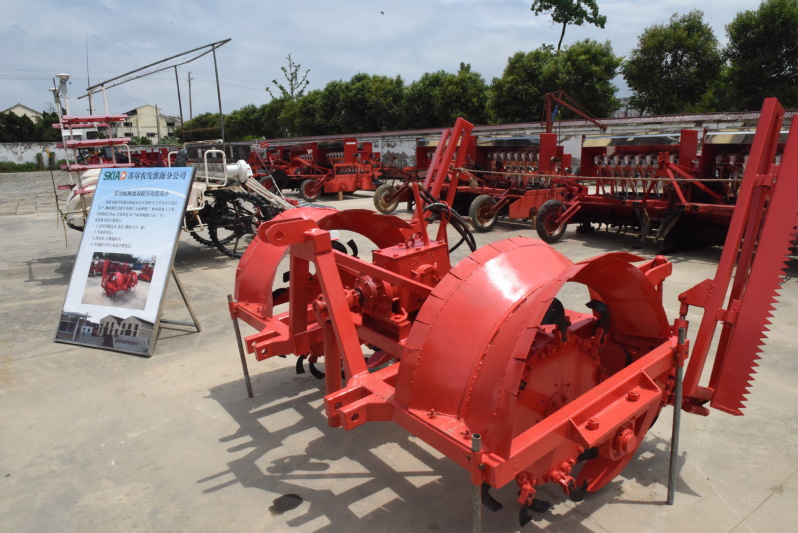 图为位于淮海农机总站大院内进行展示的带导航秧池双联开沟器。