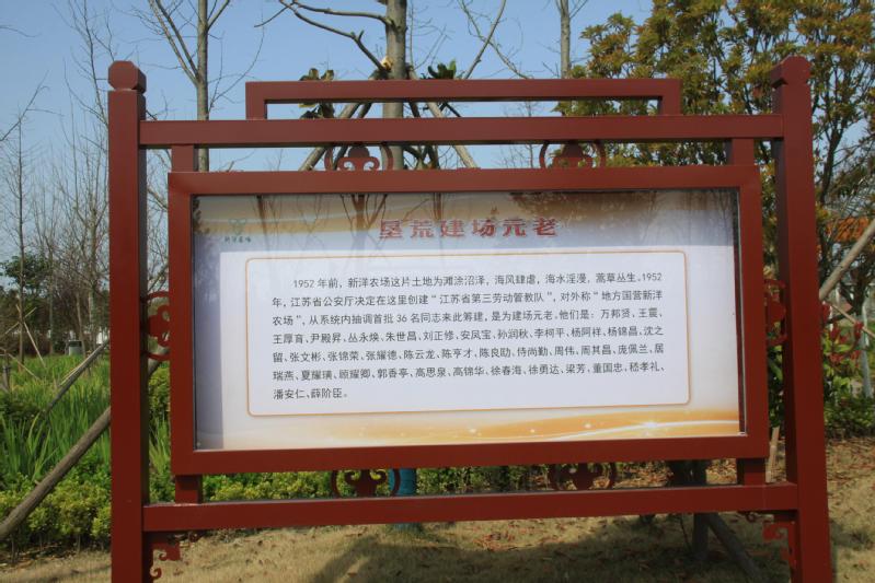 进入金龙湾古色古香的大门,绕过小石林,迎面就是一条宽宽的文化长廊,长廊两边竖立着众多的橱窗,第一块橱窗就是“垦荒建场元老”36人的名字。
