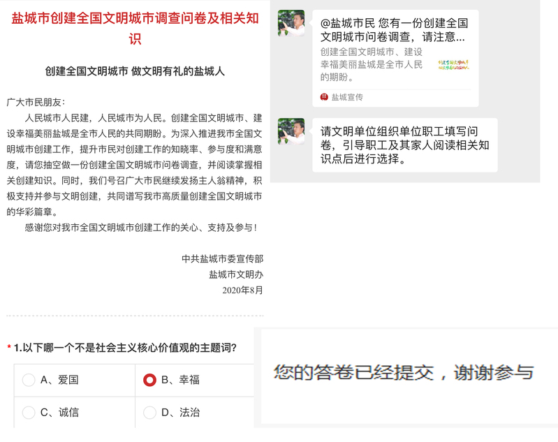活动中,公司文明办工作人员向职工居民宣传盐城市创建全国文明城市的意义和创建取得的成效,宣传人人共享文明创建成果的益处,并在职工微信群中推送调查问卷链接,动员居民积极参与到盐城市全国文明城市创建工作中来。此项工作受到了全场职工群众的普遍欢迎,大家对盐城市创建全国文明城市很有信心,纷纷表示要用自己的实际行动去影响身边的人,带动家人争创文明家庭,争做文明居民,为创建文明城市贡献出自己的力量。