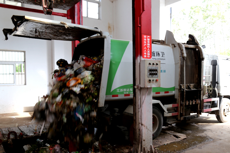 图为垃圾车将垃圾运往转运站进行压缩打包