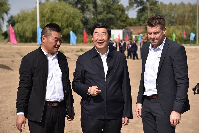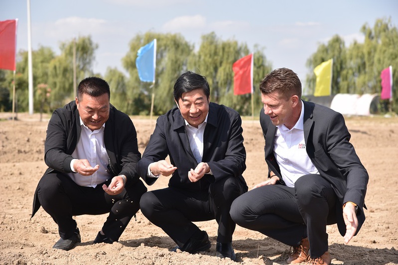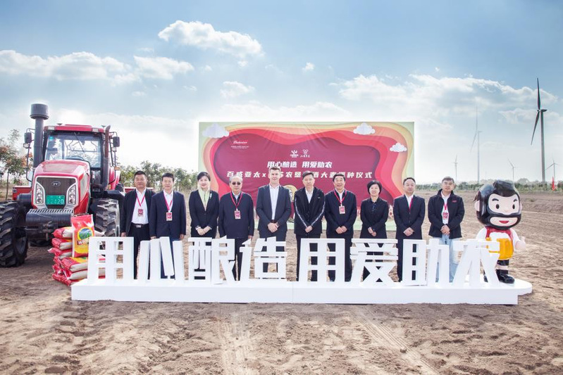 江苏省农垦集团有限公司总经理胡兆辉(中)、百威亚太采购及可持续发展副总裁杨凯与农民代表共同播下大麦种子
