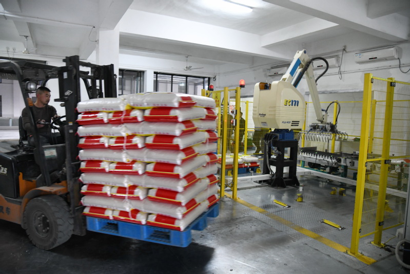 把机器人运用到生产设备上,高效的工作效率、精准的把控手段,不知疲倦的作业时间,顿时吸引了众多周边的米企来参观交流,盛赞淮海米业在粮食加工设备的更新上带了个好头。图为机器人对产品包件进行堆码和铲车运送成品大米时的镜头。