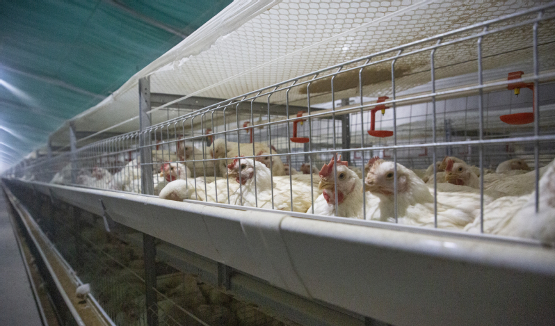 图为东米肉鸡笼养