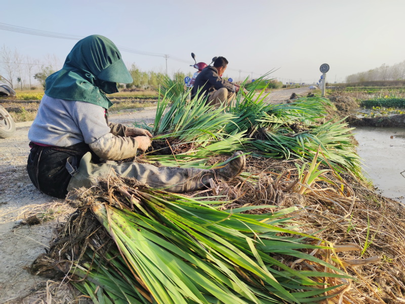 因为菖蒲草喜温暖湿润气候,喜阳光,耐严寒,所以目前进入立冬季节之时,菖蒲也是表现的非常亮眼。因菖蒲叶丛青翠苍绿,叶形端庄整齐,菖蒲叶形如剑麻般的外形,故又将它称之为“蒲剑”,或因近水而生,又名“水剑”。因为菖蒲全株有香气散发,被人们认为菖蒲有益智宽胸、耳聪目明、去湿解毒之效,因而许多人将其看作是治邪之物。所以爱莲苑每年生产的菖蒲多被外销单位布置于水景岸边浅水处,那些沼泽、溪沟、池塘等低湿地方也均可栽种。所以在外销量大之时,爱莲苑还发动苑区的员工奔走在农场的各个角落上寻找野生菖蒲,这样不仅增加了员工的额外收入,也为公司扩大产品销售拓展了丰富的外来资源。图为苑区员工正在收获菖蒲和分捡时的镜头。