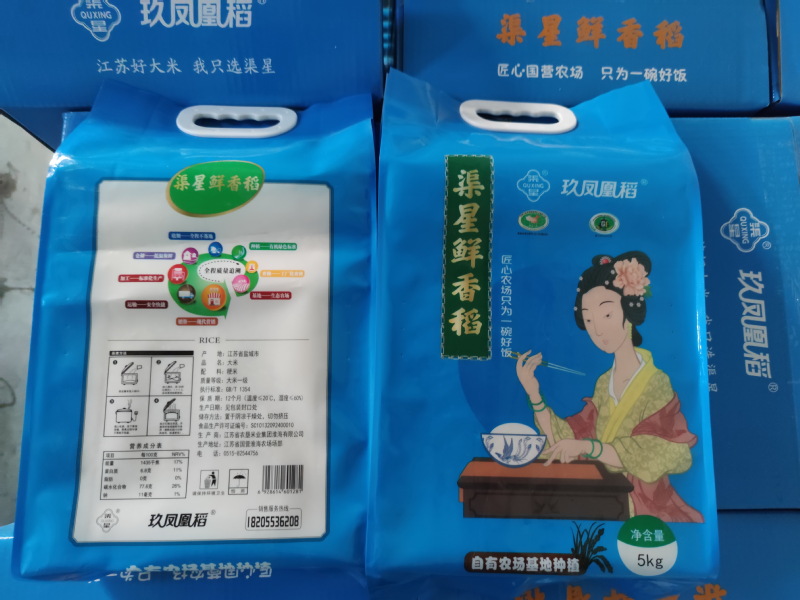 这款净含量为5公斤,以“匠心农场只为一碗好饭”的广告语和“自有农场基地种植”的文字和古代淑女手持筷子,整碗大米饭的图案,就已经够吸引人们的关注了。更何况反面印制的渠星鲜香稻有机绿色标准种植、工厂化育秧、生态农场基地、现代营销销售、安全快捷运输、标准化生产加工、低温保鲜仓储、全程不落地收割等全程质量追溯体系的建设图谱,让淮海公司生产的粳一级大米的外在形象凸显,极大地提升了渠星牌系列大米的品牌宣传,也让淮海公司众多渠星牌商标下又多了一个子品牌,扩大了市场的影响力和美誉度。图为包装袋上印制的渠星鲜香稻图案及商标。