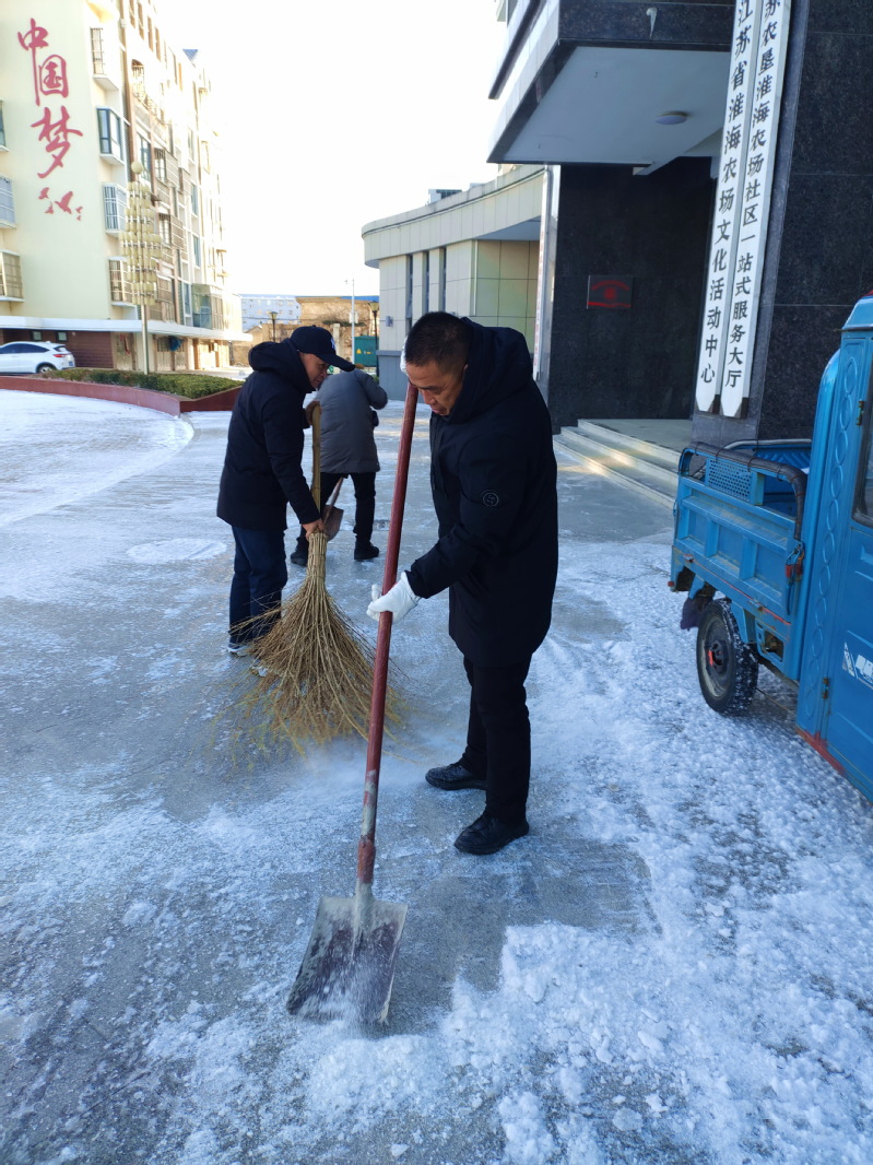 受降雪天气影响,一场7级大风裹着一场大雪伴随的寒潮侵袭了农场,特别是12月30日一大早,大门向北开的淮海农场社区门前已经被冰雪所笼盖,道路结冰又不容易融化的社区门前容易滑倒的隐患凸显,给前来办事的职工居民的出行带来了安全隐患。