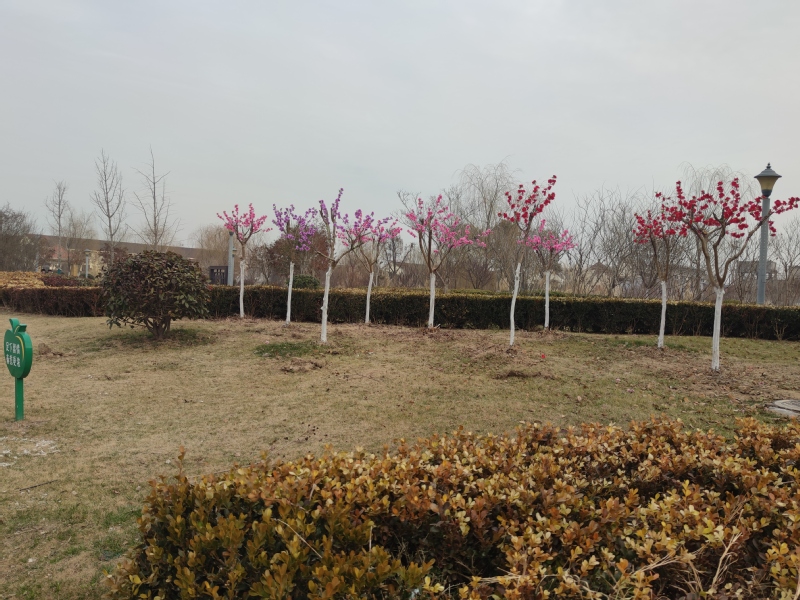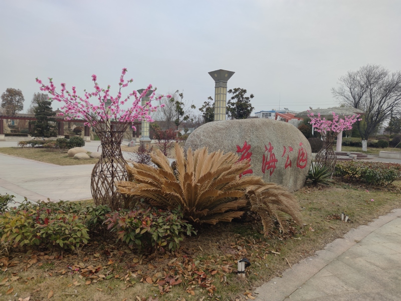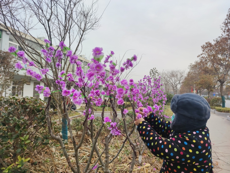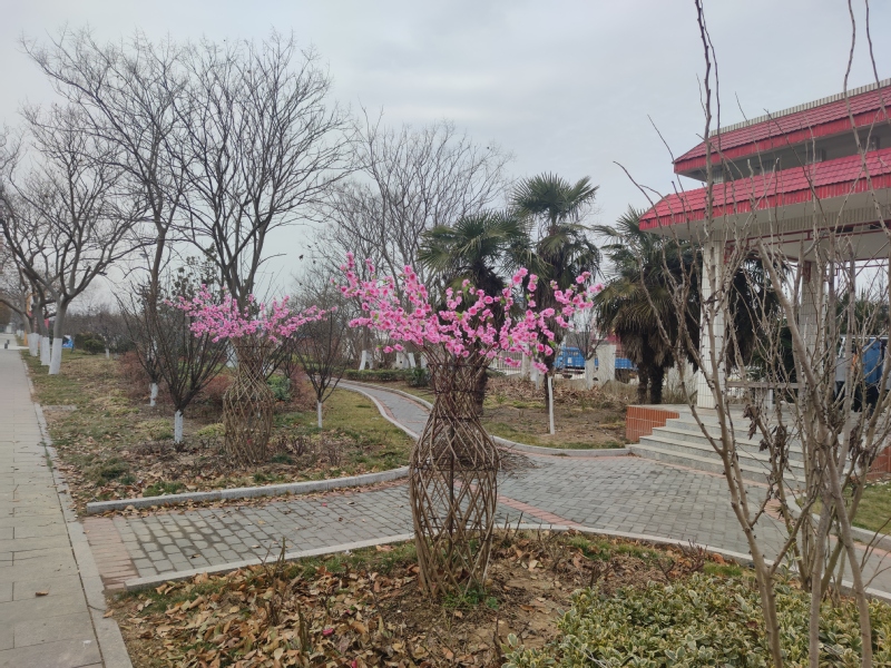 为提升文明单位的整体形象,为营造美丽淮海的生态环境,同时给传统新年增添浓郁的新春气息,淮海农场社区绿化环卫所的员工们,以淮海公园、路边公园、机关大院、居民小区等处的各种树木枯枝为阵地,通过在修剪整齐的树枝上布置色彩鲜艳的仿真花卉,让农场的主干道旁的微型公园、淮海公园和机关大院、居民小区等处的环境美丽起来,配合周边场所的设施,使其成为冬日里一道亮丽的风景线。图为绿化环卫所的员工正在布置鲜花和布置完成后枯枝鲜花开放时的镜头。