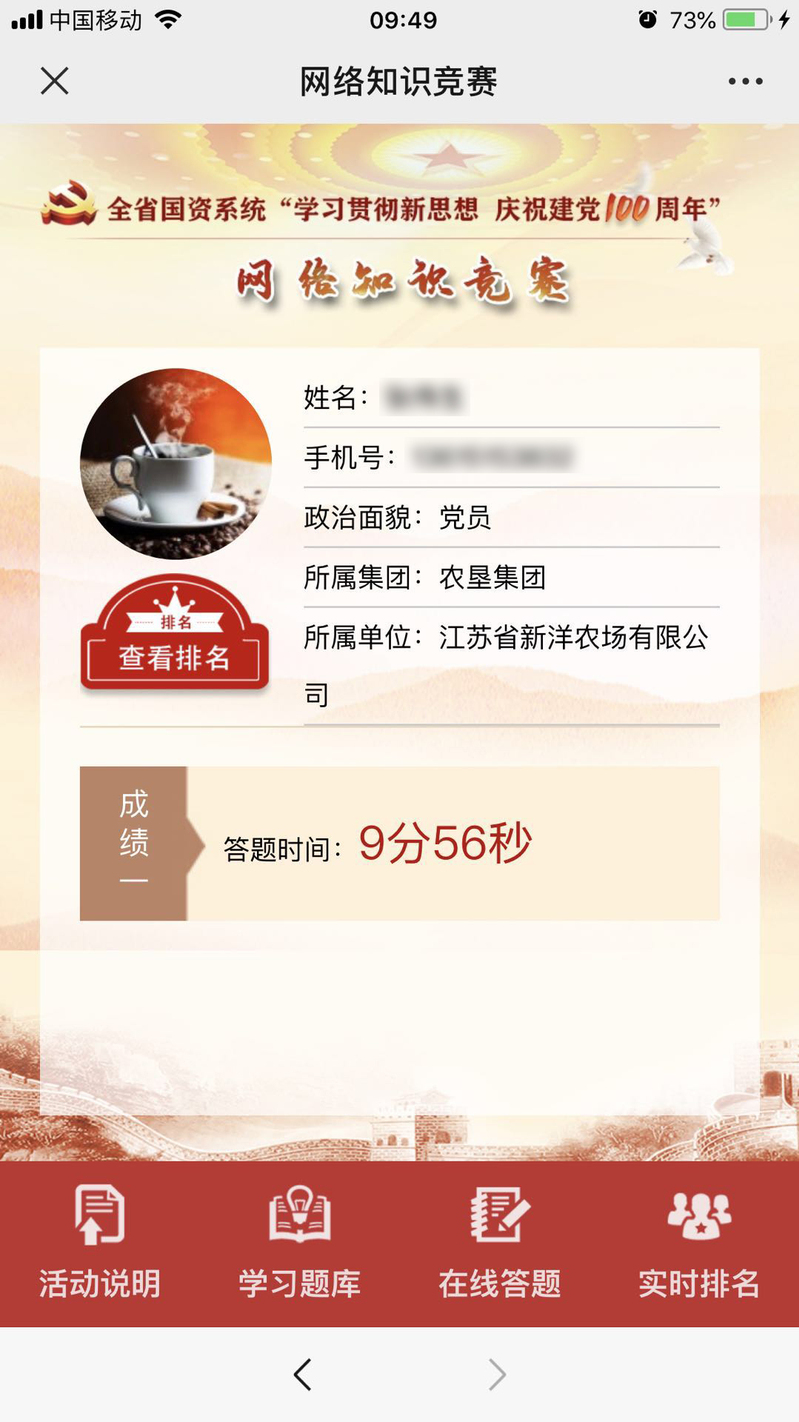 “此次答题活动截止到3月15日,从数据来看,各单位部门以及基层党支部已有90%以上的党员参与到知识竞赛活动中来了,答题活动还在持续进行中。”农场公司党委工作部相关负责人介绍,参赛者们通过参加网络学习竞赛,激发了实干担当、拼搏奋斗的热情,造浓了深入学习贯彻习近平新时代中国特色社会主义思想和庆祝建党100周年的浓厚氛围。