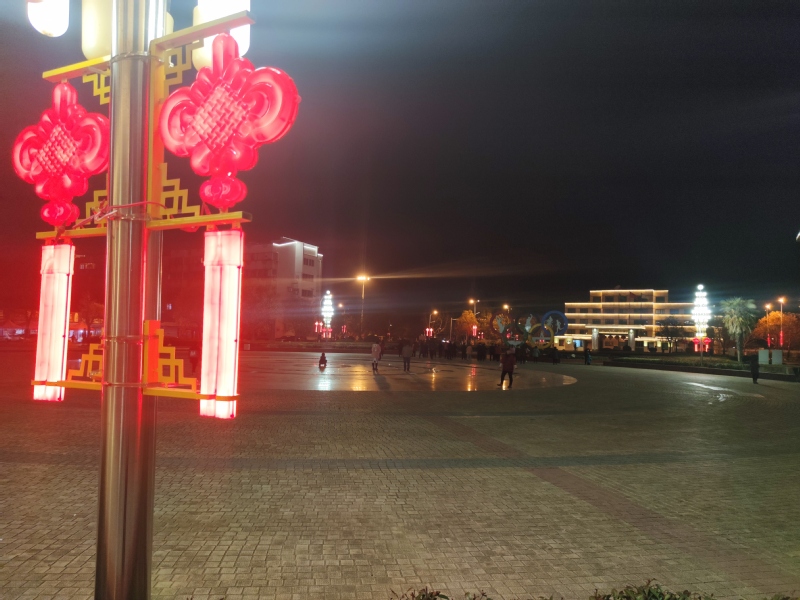 迷人的夜晚,华灯初上,人来车往,在中国结、楼宇灯光、照明灯饰的点缀装扮下,淮海农场的小城镇更加雄伟华丽。同样,淮海的城建者们,用夜晚亮有风情、游有品质,以实际行动打造出一座富饶美丽健康的淮海小城镇。图为淮海夜晚下的灯饰效果和灯光下享受生活的职工居民。