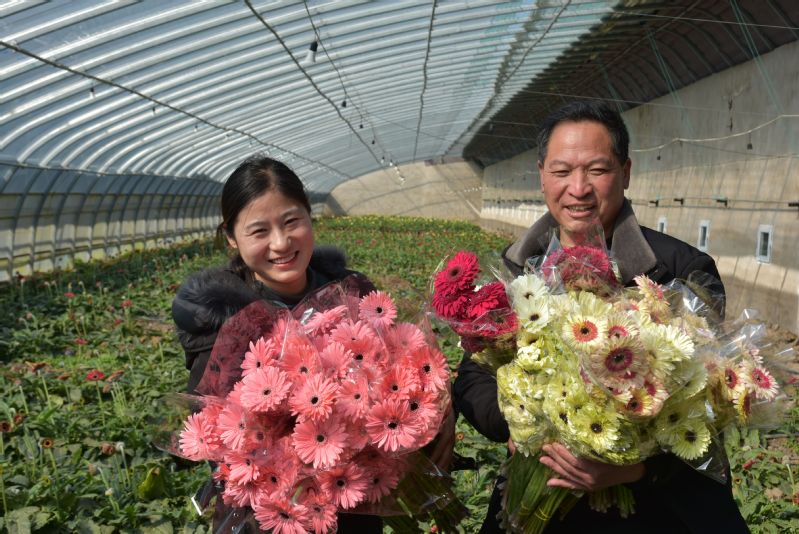 春节期间,岗埠农场富民科技园鲜花采摘迎来高峰期。由于花价持续看涨,鲜花供不应求,园区职工放弃假期,抢抓时机,共采摘百合、非洲菊等鲜花6万余枝。图为园区职工抱着刚采摘包装好的非洲菊,露出了喜悦的笑容。