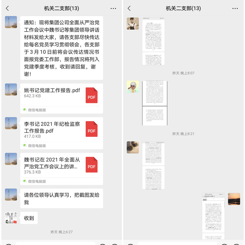 支部书记姜兵将集团全面从严治党会上魏书记《推动全面从严治党向垦区纵深发展引领保障江苏农垦高质量发展走在前列》、姚书记《围绕中心大局提升工作质效为高质量发展继续走在前列提供坚强保障》、李书记《推动新时代农垦纪检监察工作高质量发展为集团实现“十四五”良好开局提供坚强保障》三份报告发到支部微信群,要求支部每名党员认真学习贯彻领会,做好学习笔记。在原原本本学习原文的基础上,做好会议精神的贯彻落实,用领导党建工作成效引领工作实效,弘扬“三牛”精神,发挥基层党组织战斗堡垒作用和党员先锋模范作用,以昂扬的姿态力争夺取公司一季度“开门红”。