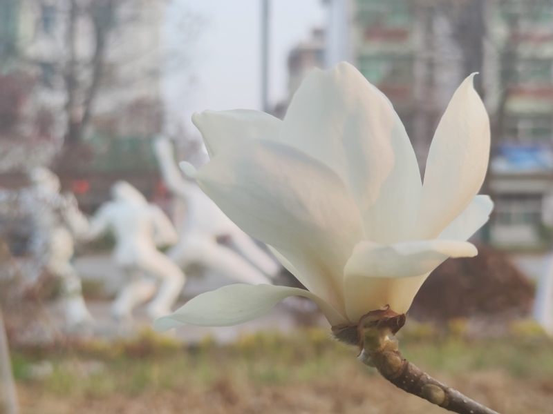 在淮海农场农业银行前的路边公园内,原本光秃的几株树枝上苞蕾鲜艳,有开着白花的,有乳白花色的、还有那紫红色花蕾的,几种花色的玉兰花渐渐开放,刹是好看,让人大有一种“忽如一夜春风来,千树万树梨花开”的感觉。只是平时不知道它的存在,而当到了三月花开,芳香四溢之时,人们才会留意着它的芳香和美丽,也会在这时,人们才会打听起它的名字 。玉兰花既是农场淮海路旁的一道美丽风景,更是绽放在人们心间的一抹风情。