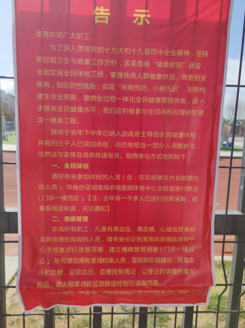 连日来,我们在淮海农场职工休闲体育运动广场,职工居民小区等人流量大的区域内看到,一张红色的告示引起了大家的注意,人们通过上前观看才发现,原来这是一张动员全民参与体检和慢性病管理防治的告示书。