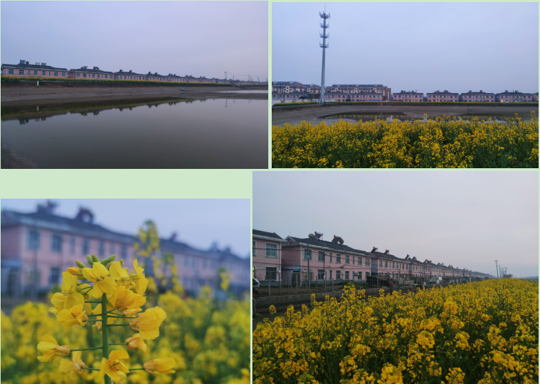 虽然农场小城镇建设的扩充,公共绿化设施的到位和景观长廊的配置,让过去场部大片大片的油菜花现在已经难得再见,但我们从一些老旧小区内家前屋后栽种的部分油菜花中,还是看到了油菜即将盛开开放的镜头。于是,利用傍晚散步的机会,特意来到苏北灌溉总渠边上遥望,果然呈现带状的油菜花已经盛开,并将农场别墅沿线装点的非常美丽。