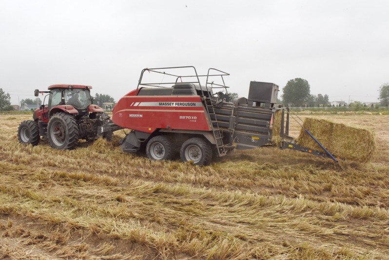 6月3日,我们在淮海农场五分场四十大队大麦收获后的田间看到,一台翻草机快速地将散落在田间的麦秸归拢成条状,一台机械打捆机随后将麦秸快速收集、压缩、打捆,并用叉车和运输车辆拖运到场地上。据测算,一捆麦秸就是一亩地大麦的草量,每捆约700多斤,一块70亩左右的农田,从收草打捆到草捆全部离田仅两三个小时,整个过程一气呵成。大麦秸秆移出农田,可以有效地提高水田的整地质量,减少因麦秸日后发酵产生的有毒气体对作物的毒害,缓解土壤的碳氮比,这对作物高产稻产十分有利。