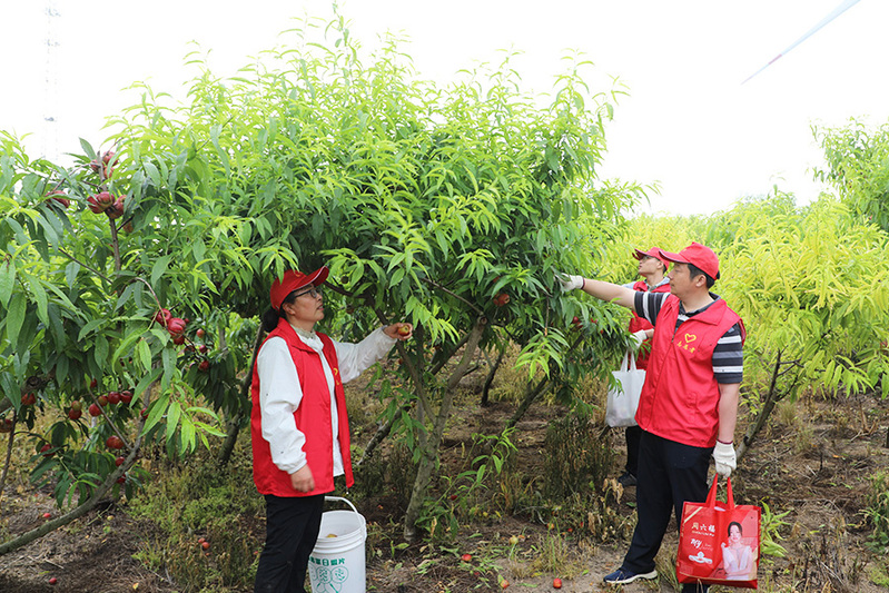 6月12日,临海农场百果园里热闹非凡,来自机关第一党支部、社区党总支的志愿者,到绿农园公司帮忙采摘油桃。