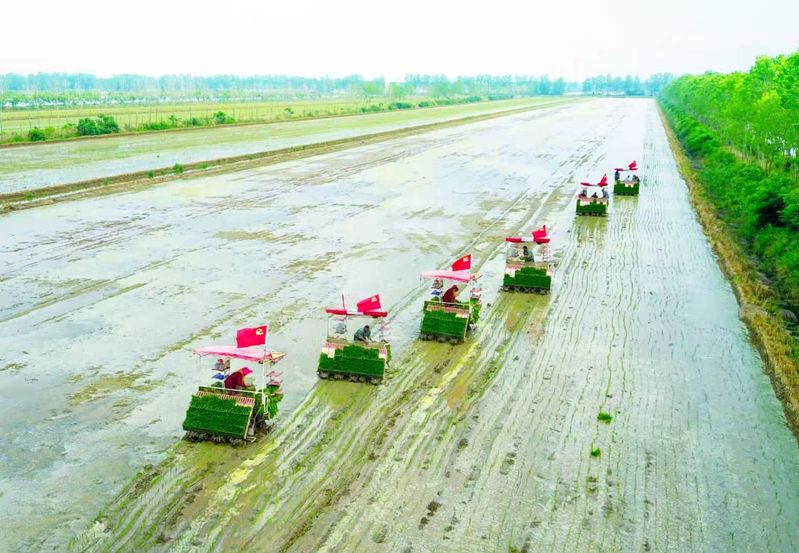 100多台插秧机奔忙在田间,功夫不负有心人,新洋分公司终于按质按时完成了插秧任务,向建党100周年献上了一份厚礼。