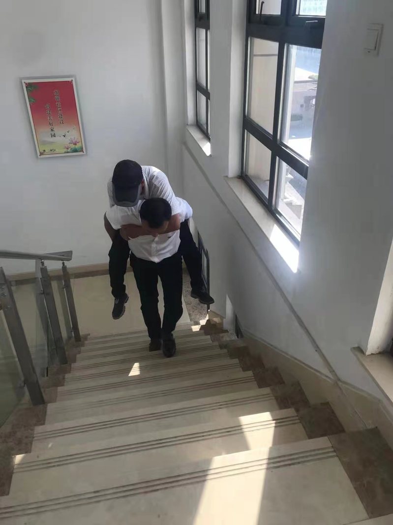 下午4时许,一位近60岁的右腿残疾村民,满头大汗、步履艰难地来到社区一楼大厅,右手紧紧握着楼梯扶手,准备上至三楼进行接种。看到他蹒跚挪步时的镜头,大厅工作人员纷纷站立起来准备上前进行搀扶时,社区工作人员、城西党支部副书记董伟一个健步冲了过去说:“我是共产党员,我个大,我来背!”说完,他走到该村民身边,蹲下身上,叫这位村民趴在他的背上,然后手托着屁股,一步一步地走上了三楼的疫苗接种室。