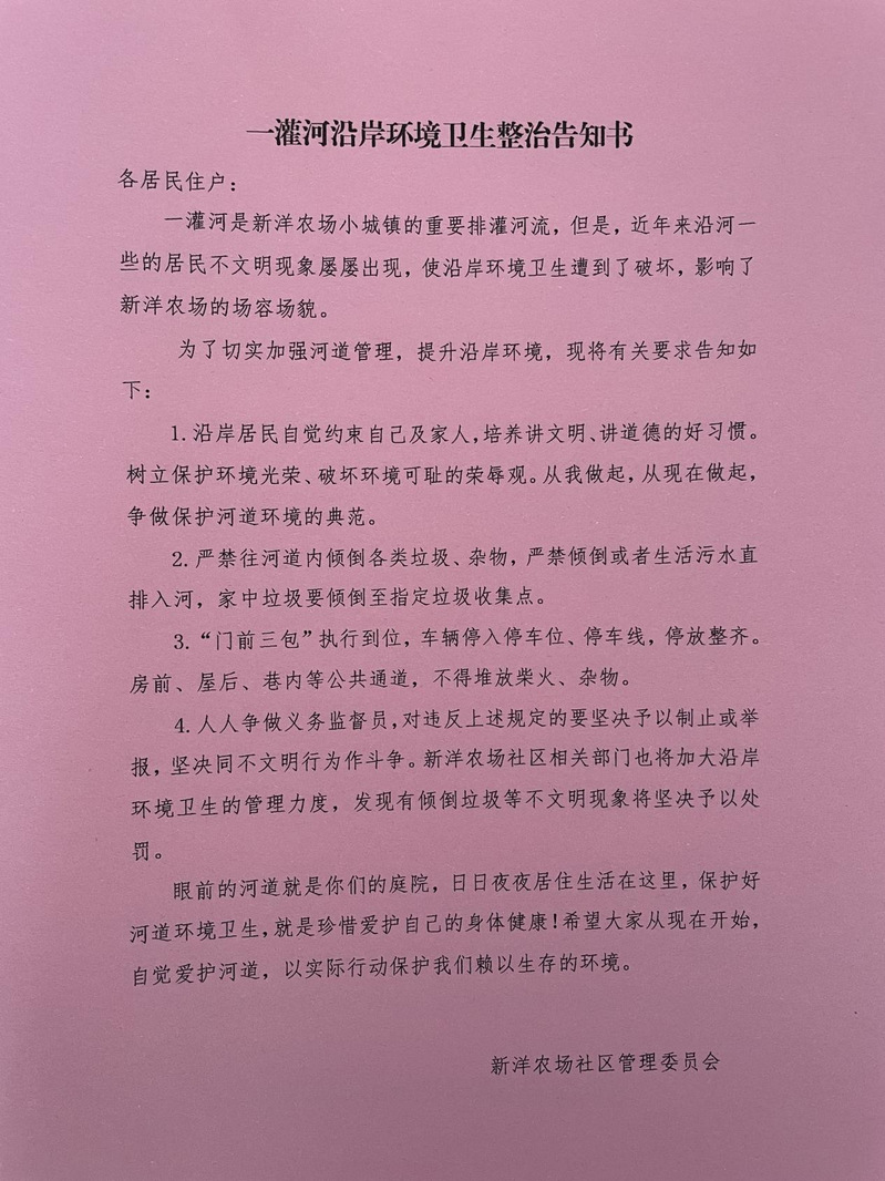近日,新洋农场社区城管队联合居委会工作人员,对一灌河沿岸纬四路住户进行了入户拜访,给居民发放《一灌河沿岸环境卫生整治告知书》。