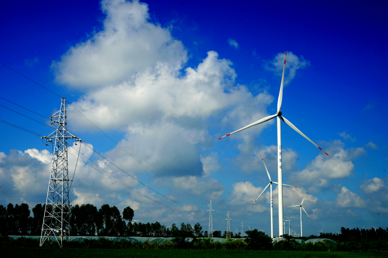 转动的风轮,高高的输电线铁塔,镶嵌在蓝天与绿禾之间。