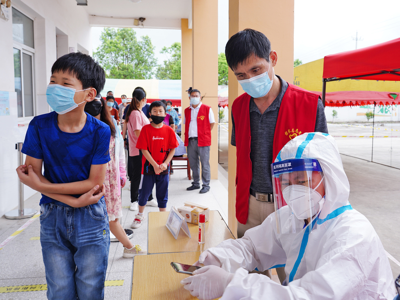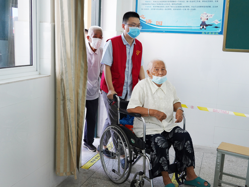 “您好,请出示您的健康码和行程码”,在测温区,志愿者们耐心地为参与演练的居民们测体温,检查健康码和行程码,用高度的责任心守住第一道关心。“老大爷,您行动不便,请走这边的专用通道”,在缓冲区,志愿者们及时引导并一趟趟搀扶老年通过专用快速进行检测。“请大家做好一米间隔,戴好口罩”,等待区内,志愿者们随时提醒排队人群做好自我防护,保障临检队伍秩序井然。炎热的天气,信息采集区身穿隔离服的志愿者们早已汗湿衣裳,却没有人喝一口水。