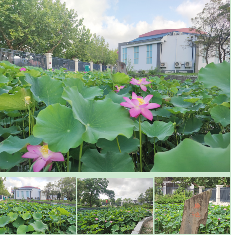 在农建四师暨淮海农场历史陈列馆西侧,一池廉池中的荷花开得正艳,高高低低的荷花点缀在绿色的莲蓬间,十分好看。人们或通过大门进去,驻足在莲池边近距离地观看,感受下莲的魅力;或透过古色古香的围栏欣赏,也别有一番滋味。
