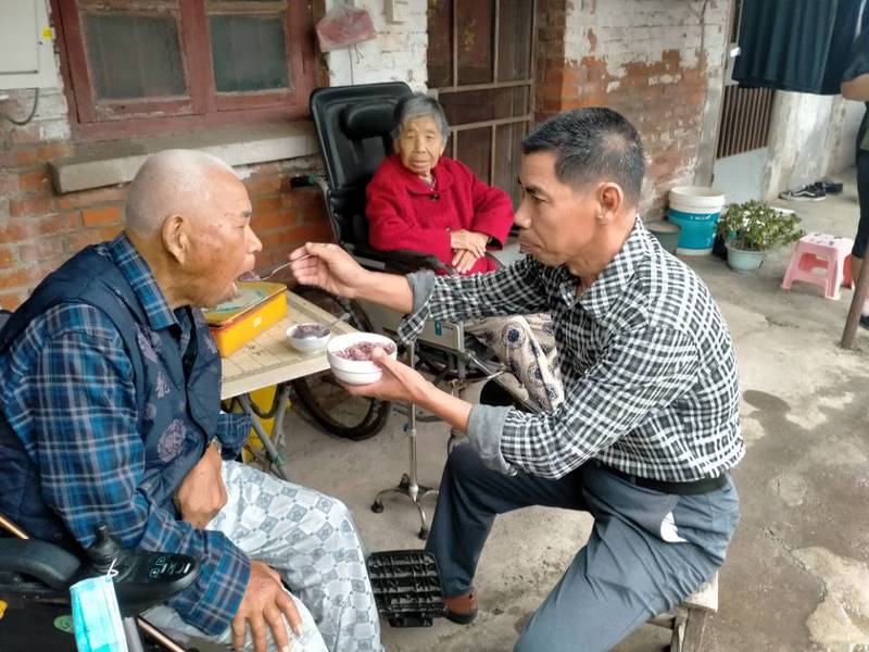 “天有不测风云、人有祸福旦夕”,本来照顾一个瘫痪的父亲,十几年如一日就已经足够他忙碌的了,2015年70岁的老母亲也患脑瘫和心脏病,并伴有眼疾,视力几乎失明。2019年由于眼睛视力低下,走路一不小心,又把腿摔断了,造成生活不能自理,就这样唐素强一个人一下子就承担起两位老人的照料工作,为了方便更好的照顾双亲,他就搬到父母的住处,他每天都要给父母双亲擦拭、按摩身体,洗脚、洗涤,平时老人会感到无聊,精神不振,唐素强就利用闲暇的时间陪着父母说话解闷,为了让老人尽快康复,自己从零学习康复方面的知识,挽扶老人进行康复锻炼,经常用轮椅推着父亲或母亲外出,感受新鲜空气,看看风景,调节父母情绪。